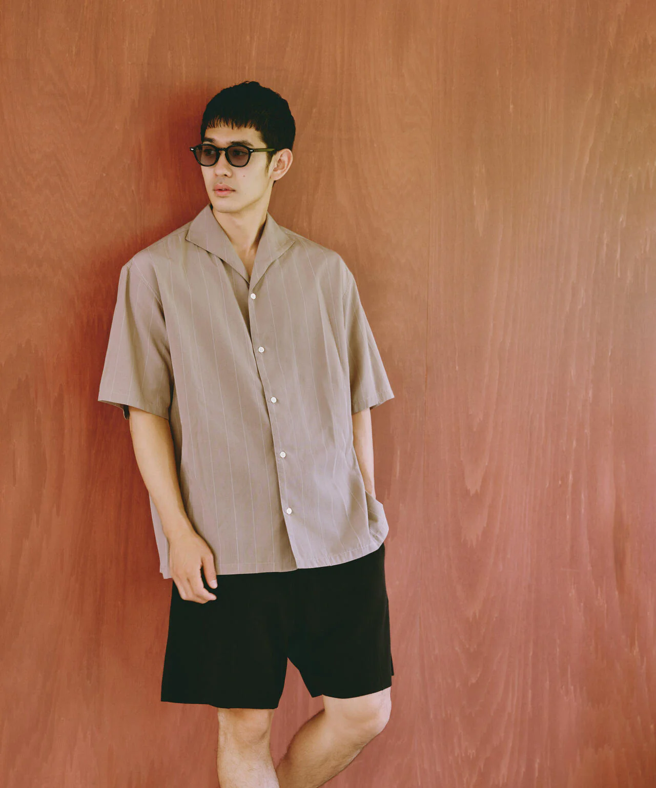 -70%リネンブレンドピンストライプワイドカラーシャツ(セットアップ可)—