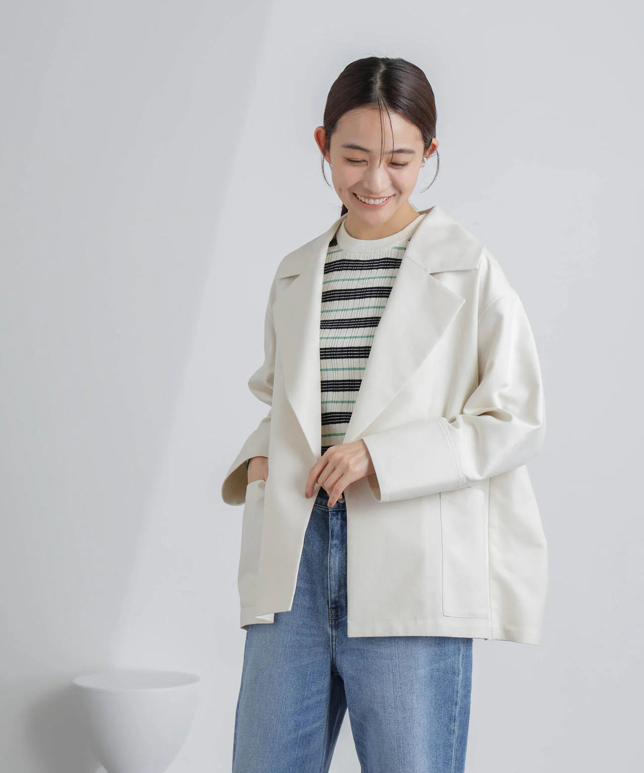 大きなラペルが印象的なミドル丈コート。オーバーサイズのシルエットに、フロントは釦などを省いたシンプルなデザインに仕上げました。袖が太めのデザインなので、袖口をくしゃっと折りあげたラフな着こなしも楽しめるひと品です。