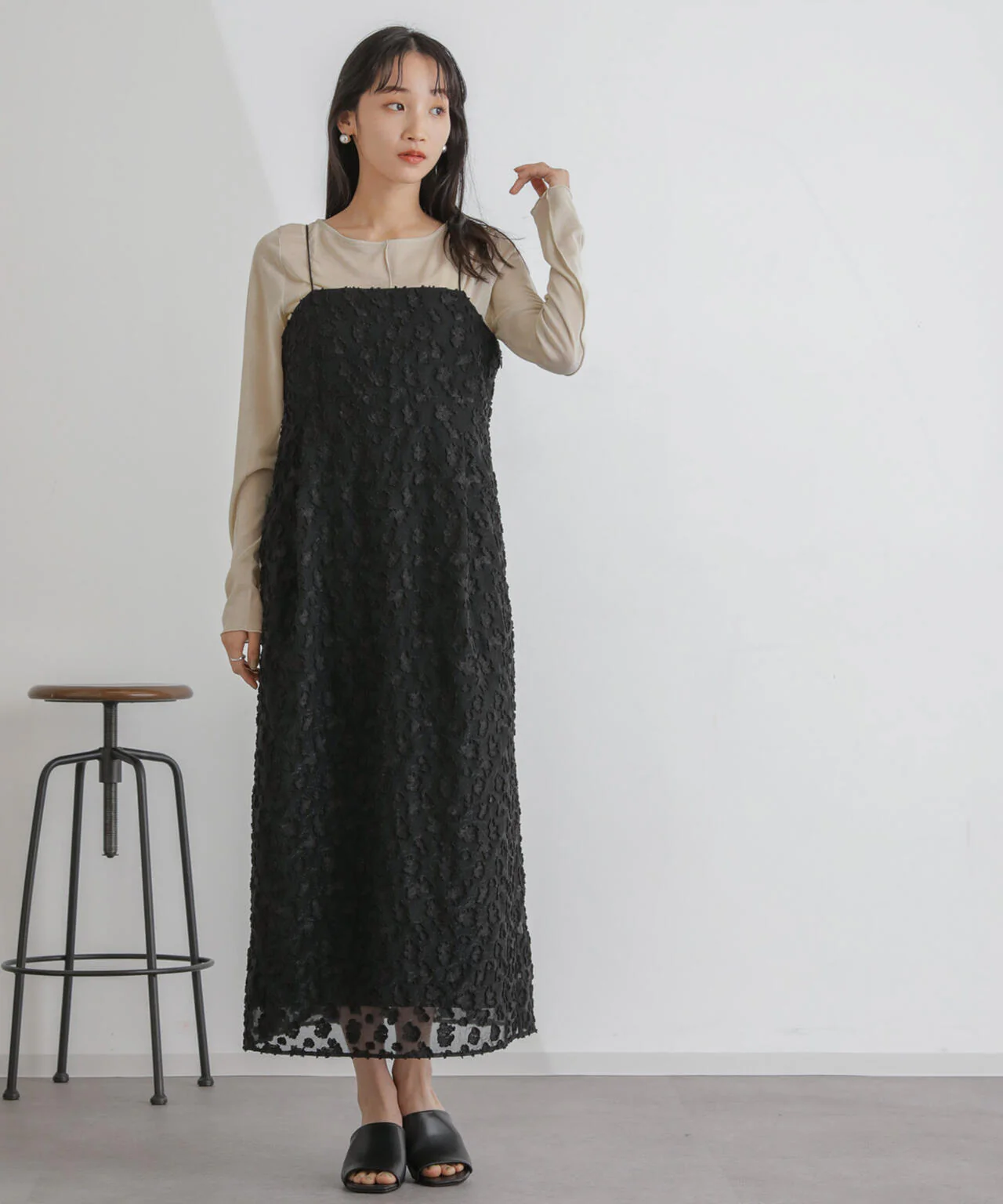 コクーン風縦長シルエットが女性らしさを引き立ててくれるキャミワンピース。華奢な肩ストラップと後ろの細リボン仕様がこなれ感のある着こなしを叶えます。シンプルなTシャツをインしてカジュアルなレイヤードスタイルで着こなしても素敵。華やかなシアージャガード素材で、デイリーの着回しからちょっとしたお呼ばれシーンまで幅広く活躍します。