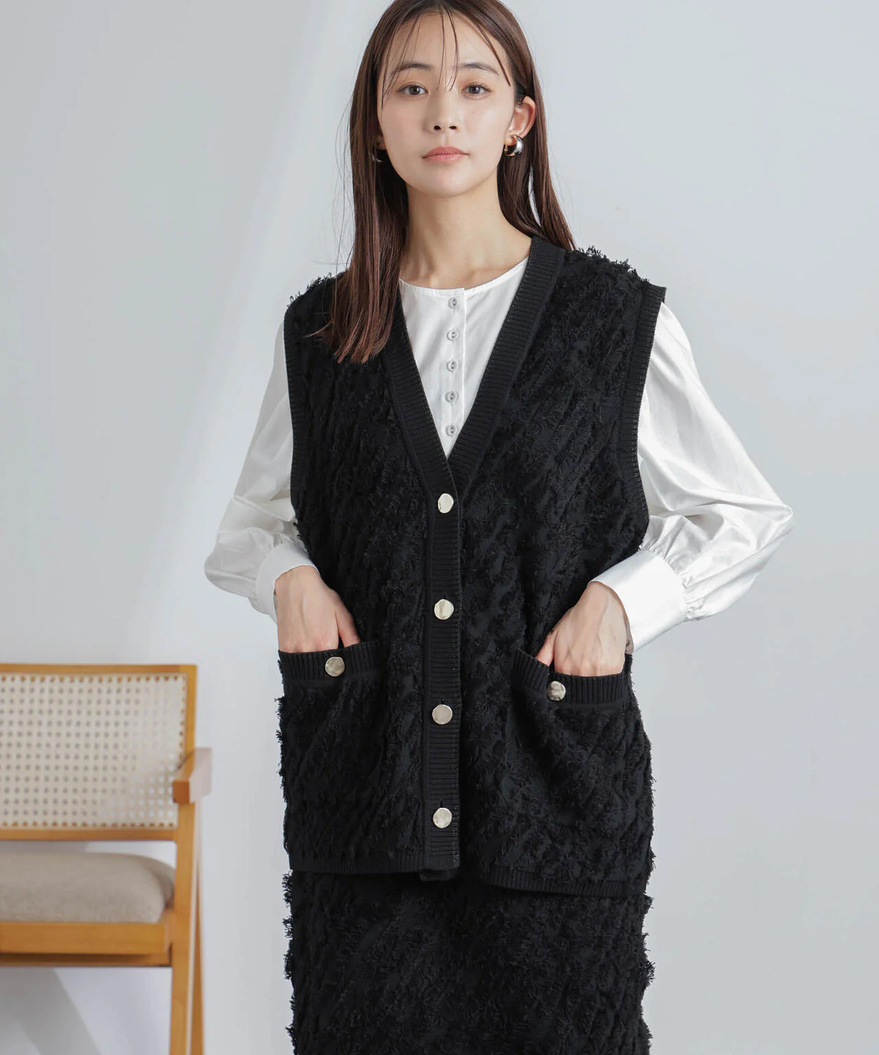 フリンジジャガードの編地が目を惹く華やかなニットベスト。深Vネックのややオーバーサイズで、前端とポケット口にはラメを引き揃えさりげなくキラキラ光るようにしており、ヴィンテージ調のゴールドボタンもポイントの一枚。春はシャツやカットソーとレイヤードしたり、気温が上がってきたらノースリーブ合わせの着こなしもおすすめなコーディネートの主役になるアイテムです!