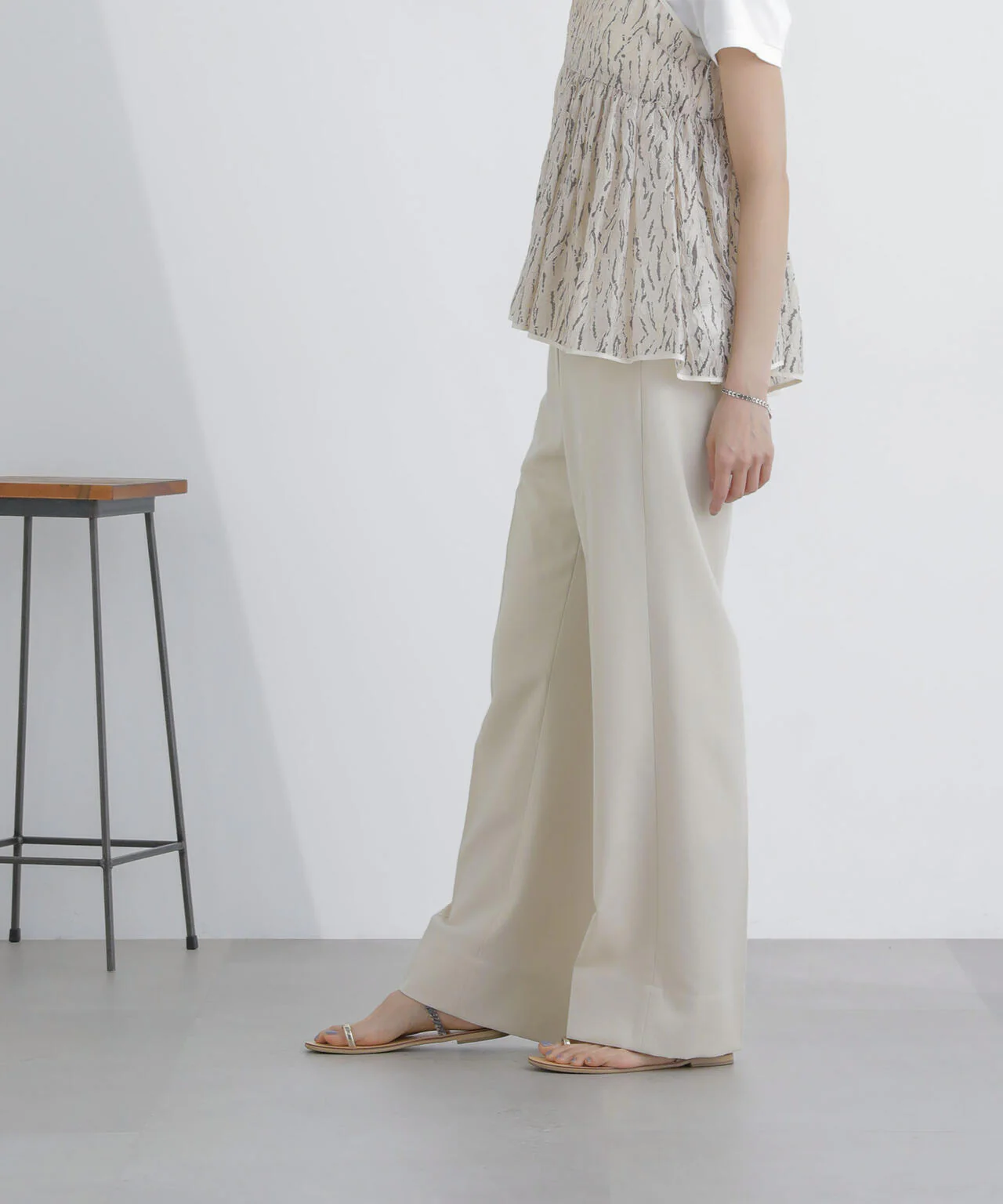 キレイめにもカジュアルにも着こなせる万能なワイドパンツ。やや太めのウエスト仕様に、徐々に広がるワイドシルエットが美脚効果を発揮。同素材のロングジレとセットアップコーデはもちろん、Tシャツ合わせで休日スタイルなど幅広いシーンで活躍が期待できます!