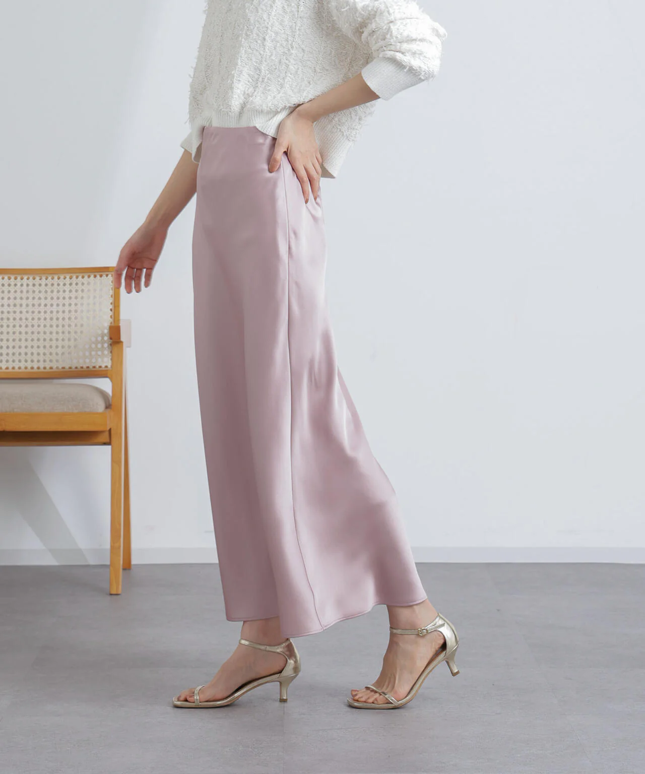 ・スタイリングに華やかさを添えるサテン素材のロングスカート