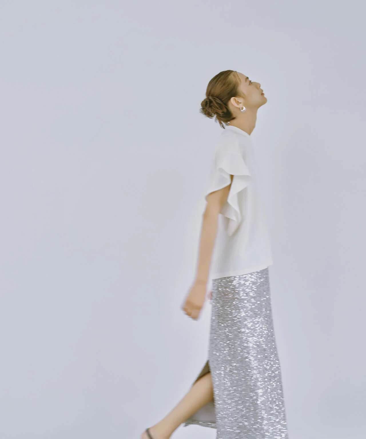 ・小粒のスパンコールをランダムに刺繍した別注素材を使用