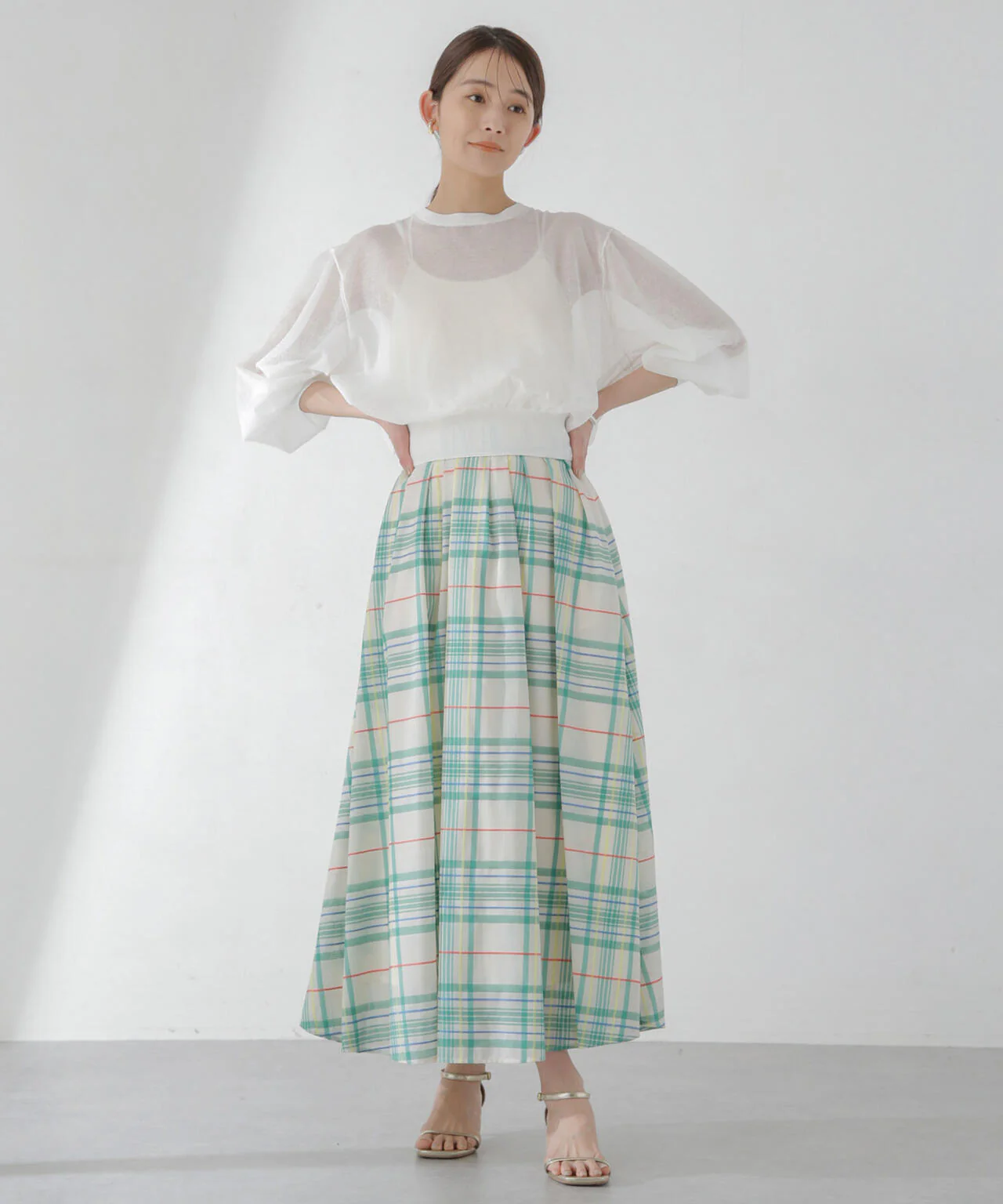 ・差し色になる発色の良いチェック生地とボリューム感が目を惹くマキシスカート