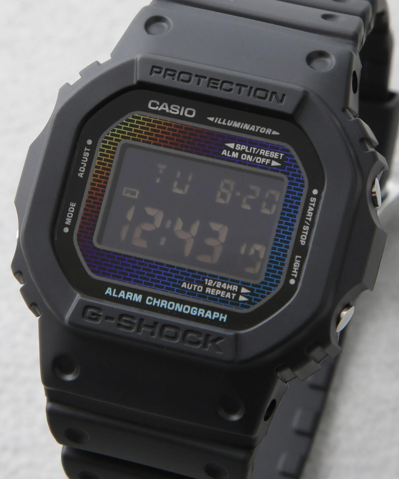 1983幎ã®çºå£²ä»¥æ¥ã飜ããªã匷ããæ±ããŠé²åãç¶ããã¿ããã¹ãŠãªããG-SHOCKãããã¬ã©ã¹æ¿ãæåæ¿ã«èžçãæœããRainbow Brick Wall seriesã®ç»å Žãå ã®åå°ã«ããæ§ã ãªè²åããèŠããã¬ã€ã³ããŒã«ã©ãŒã®ã¬ã³ã¬ãã¿ãŒã³ããã¶ã€ã³ãèŠã人ã®è§åºŠã«ãã£ãŠãããããªè¡šæ ã«ãªãããã¡ãã·ã§ã³ã¢ã€ãã ãšããŠã掻çšã§ããã¢ã€ãã ã§ãã