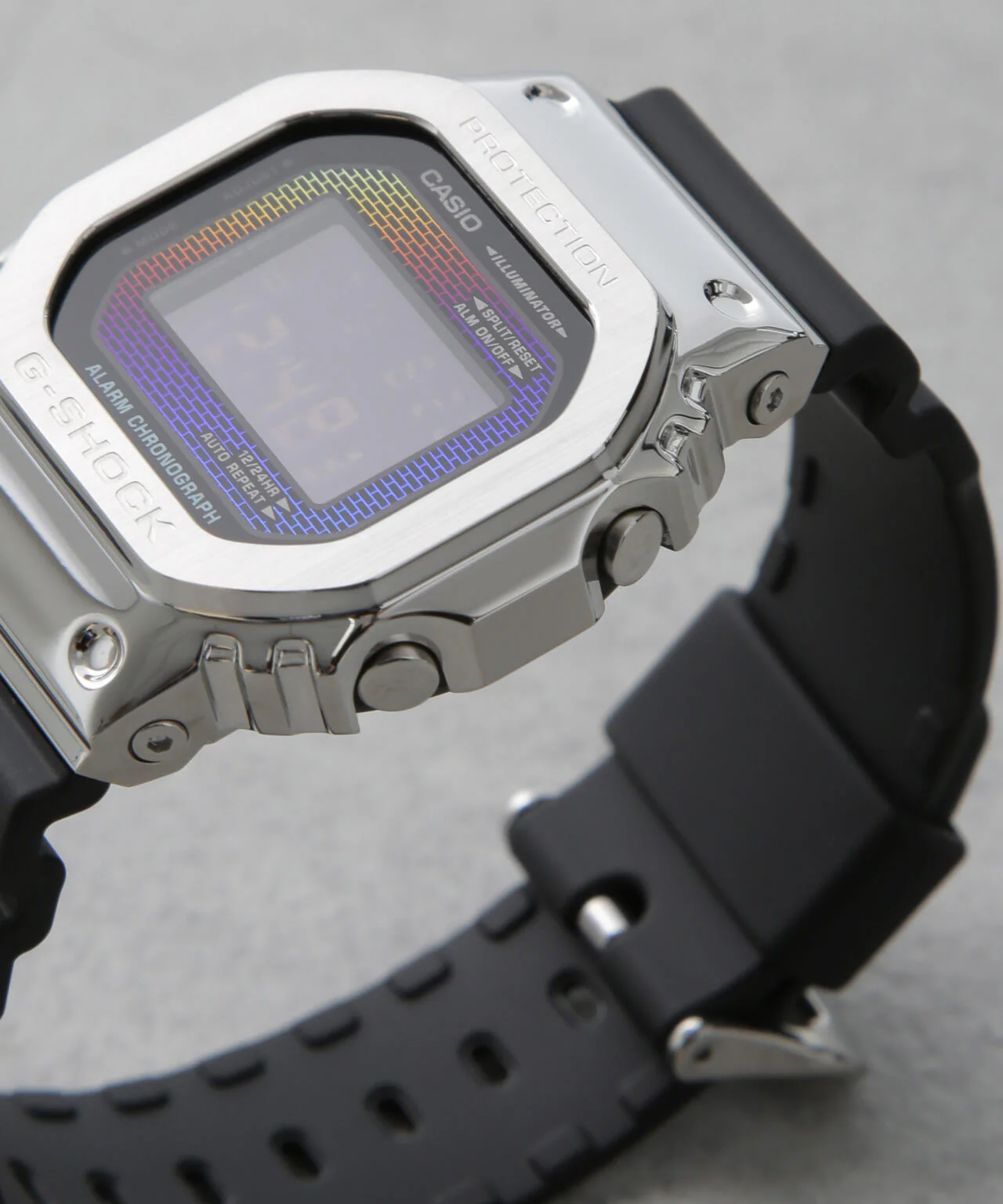 1983年の発売以来、飽くなき強さを求めて進化を続けるタフネスウオッチG-SHOCKから、ガラス板、文字板に蒸着を施したRainbow Brick Wall seriesの登場。光の反射により様々な色合いを見せるレインボーカラーのレンガパターンをデザイン。見る人の角度によっていろりろな表情になり、ファッションアイテムとしても活用できるアイテムです。